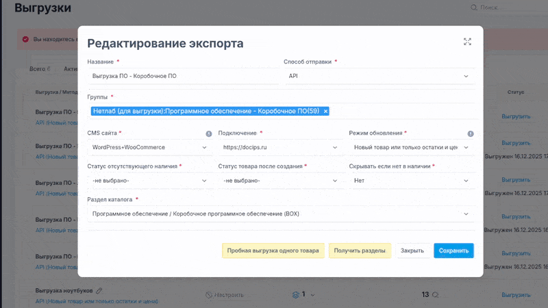 Добавлены режимы выгрузки: Статус отсутствующего наличия "Нет в наличии" или "Предзаказ", Статус товара после создания "Опубликован", "На модерации" и тд. Теперь производитель и многочисленные параметры товара автоматически создаются при выгрузке.