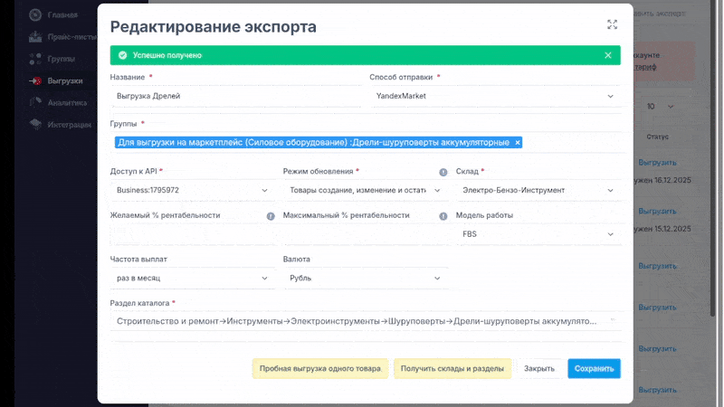 Как это работает? После загрузки товаров поставщика, известны цена поставщика и габариты. Далее формируем ассортимент для выгрузки с указанием наценки для цены продажи, например цена поставщика 1 000 руб, цена продажи + 100% = 2 000 руб. При отправке на Яндекс Маркет комиссия маркета будет рассчитана на основе габаритов, цены продажи и категории товаров. Комиссия маркета примерно это 46%: 2000 - 920 - 1000 = 80 руб (8 % от цены поставщика) - валовая прибыль от продажи товара. При настройке желаемого процента рентабельности система автоматически увеличит цену продажи для достижения желаемого %. В данном примере, цена продажи автоматически поднимется примерно до 2450 руб. (2450 - 1127 - 1000 = 323 руб) - где рентабельность по себестоимости 32%.