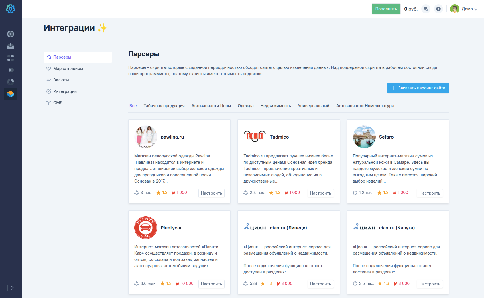 Используйте имеющиеся в базе веб-парсеры популярных площадок Cian, Citilink, Drom, Avito