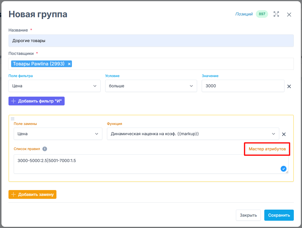 Новый функционал - Мастер атрибутов При создании группы, с последним обновлением, появился очень удобный функционал - Мастер атрибутов. Он позволяет превращать неудобный для понимания внешний вид записи, к примеру, условий для «динамической наценки на коэффициент» в понятный табличный вид, с возможностью добавления новых значений.